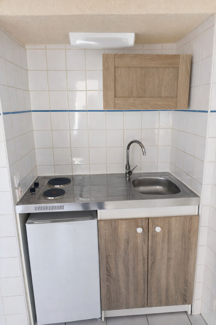 L’appartement se compose d’une pièce principale avec fenêtres, d’un coin cuisine équipé (plaques, réfrigérateur, rangements) et d’un espace de vie facilement aménageable.